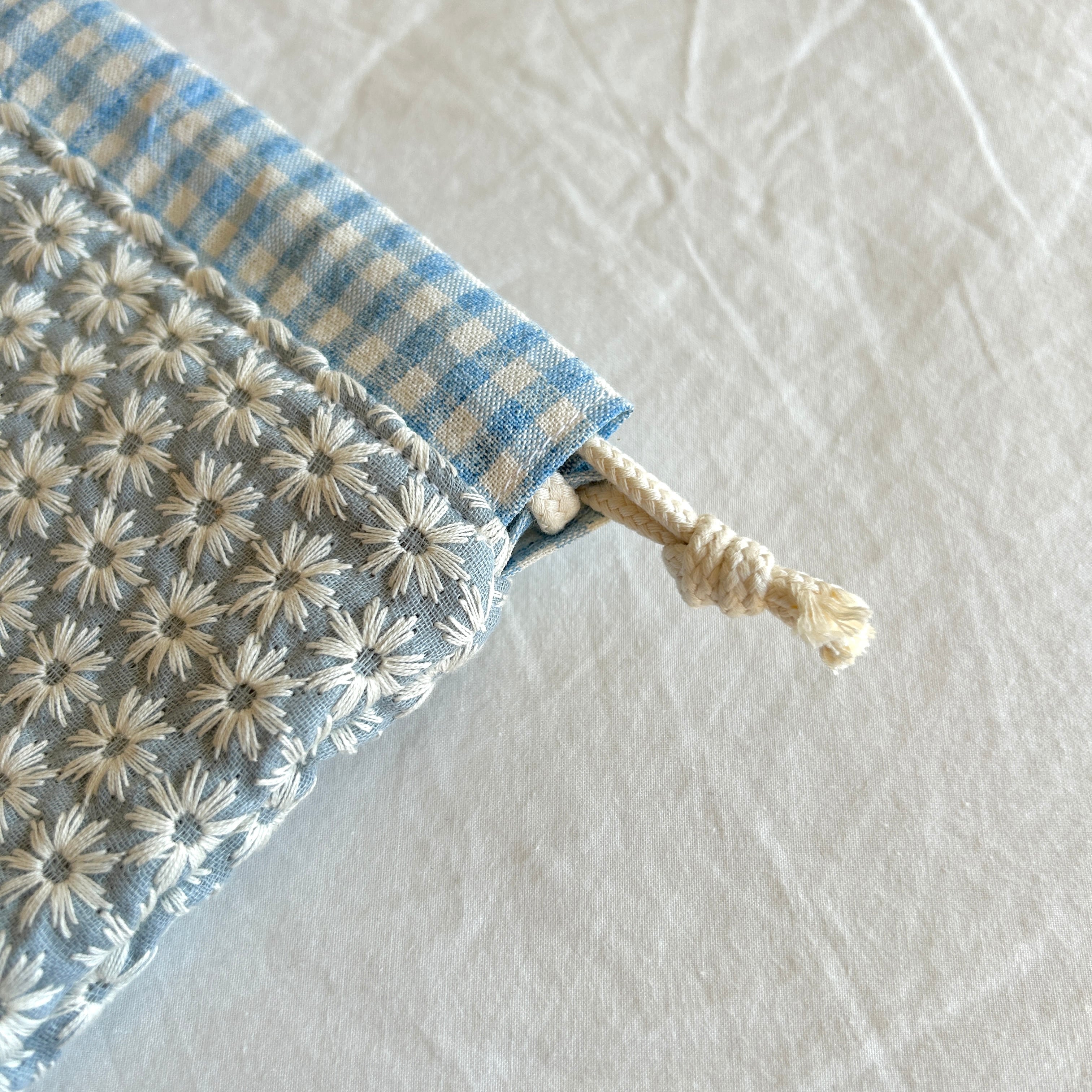 淡い水色にマーガレット刺繍の生地をふんだんに使用した巾着ポーチ